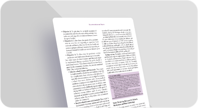 Recommendations and Reports • Objective 1: To gain time for an initial assessment of not reduce ILI transmission in the rural community (86). transmissibility and clinical severity of the pandemic virus Similarly, closing 559 Michigan schools at least once in the very early stage of its circulation in humans (closures during the fall wave (i.e., second wave) of the 2009 H1N1 for up to 2 weeks) pandemic had little effect on community levels of ILI (87). • Objective 2: To slow down the spread of the pandemic For more information about preparing for influenza and virus in areas that are beginning to experience local the different types of dismissals, see CDC websites regarding outbreaks and thereby allow time for the local health care 1) child care facilities (https://www.cdc.gov/h1n1flu/childcare/ system to prepare additional resources for responding to toolkit/pdf/childcare_toolkit.pdf), 2) K–12 schools (https:// increased demand for health care services (closures up to www.cdc.gov/h1n1flu/schools/toolkit/pdf/schoolflutoolkit.pdf), 6 weeks) and 3) institutions of higher education (https://www.cdc.gov/ • Objective 3: To allow time for pandemic vaccine h1n1flu/institutions/toolkit/pdf/IHE_toolkit.pdf). production and distribution (closures up to 6 months) Settings and use. Preemptive, coordinated school closures Two other types of school closures and dismissals might and dismissals might be implemented at child care facilities, be implemented during a pandemic for public health or K–12 schools, and institutions of higher education. They are institutional reasons. These interventions do not slow disease most likely to be implemented when an influenza pandemic spread in the community; therefore, they are not considered is severe, very severe, or extreme (Table 10). Secondary NPIs. They include the following: consequences include missed work and loss of income for • Selective school closures and dismissals: These might parents who stay home from work to care for their children be implemented by schools that serve students at high risk and missed opportunities to vaccinate school-aged children ††† for complications from infection with influenza, rapidly unless other mechanisms are considered. especially when transmission rates are high. For example, a school that serves children with certain medical CDC recommendations conditions or pregnant teens might decide to close while School closures and dismissals: CDC might recommend the use of preemptive, coordinated school closures and dismissals during severe, other schools in the area remain open. In addition, some very severe, or extreme influenza pandemics. This recommendation is in communities or early childhood programs might consider accord with the conclusions of the U.S. Community Preventive Services Task Force (https://www.thecommunityguide.org/findings/emergency- closing child care facilities to help decrease the spread of preparedness-and-response-school-dismissals-reduce-transmission- influenza among children aged <5 years. Selective pandemic-influenza), which makes the following recommendations: dismissals are intended to protect persons at high risk for • The task force recommends preemptive, coordinated school dismissals during a severe influenza pandemic. influenza rather than to help reduce virus transmission • The task force found insufficient evidence to recommend for or within the community. against preemptive, coordinated school dismissals during a mild or moderate influenza pandemic. In these instances, jurisdictions should • Reactive school closures and dismissals: These might be make decisions that balance local benefits and potential harms. implemented when many students and staff members are ill and not attending school or when many students and Social Distancing Measures for Schools, staff members are arriving at school ill and being sent Workplaces, and Mass Gatherings home. For example, a child care center might close because it is unable to operate under these conditions. Reactive Social distancing measures can reduce virus transmission dismissals, which might occur during outbreaks of seasonal by decreasing the frequency and duration of social contact influenza (85) and during pandemics (15), are unlikely to among persons of all ages. These measures are common-sense affect virus transmission because they typically take place approaches to limiting face-to-face contact, which reduces after considerable, if not widespread, transmission has person-to-person transmission. already occurred in the community. For example, a 4-day Rationale for use as a public health strategy. Social reactive closure in a western Kentucky school district did distancing measures that reduce opportunities for person-to- person virus transmission can help delay the spread and slow ††† Persons at high risk for influenza-related complications include children aged the exponential growth of a pandemic. The optimal strategy is <5 years (and especially aged <2 years), adults aged ≥65 years, pregnant to implement these measures simultaneously in places where women, residents of nursing homes and other long-term care facilities, and American Indians/Alaska Natives. Those at high risk also include persons persons gather. Although direct evidence is limited for the with asthma, neurological and neurodevelopmental conditions, chronic lung effectiveness of these measures, components of the strategy disease, and heart disease; disorders of the blood, endocrine system, kidney, might include reducing social contacts at the following places: or liver; metabolic disorders; and weakened immune systems from disease or medication. Two other groups at higher risk are persons aged <19 years who • Schools: Children have higher influenza attack rates than receive long-term aspirin therapy and those with extreme obesity (https:// adults, and influenza transmission is common in schools. www.cdc.gov/flu/about/disease/high_risk.htm). US De