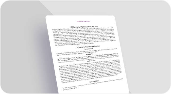 Recommendations and Reports CDC Community Mitigation Guidelines Work Group Alexandra Levitt, PhD, Office of Infectious Diseases, CDC, Stephanie Dopson, ScD, Influenza Coordination Unit, Office of Infectious Diseases, CDC, Mark Frank, MPH, Influenza Coordination Unit, Office of Infectious Diseases, CDC, Rachel Holloway, Influenza Coordination Unit, Office of Infectious Diseases, CDC, Lisa Koonin, DrPH, Influenza Coordination Unit, Office of Infectious Diseases, CDC, Sonja Rasmussen, MD, Influenza Coordination Unit, Office of Infectious Diseases, CDC, Stephen Redd, MD, Influenza Coordination Unit, Office of Infectious Diseases, CDC, Christopher de la Motte Hurst, MPH, Division of Global Migration and Quarantine, National Center for Emerging and Zoonotic Infectious Diseases, CDC, Neha Kanade, MPH, Division of Global Migration and Quarantine, National Center for Emerging and Zoonotic Infectious Diseases, CDC, Noreen Qualls, DrPH, Division of Global Migration and Quarantine, National Center for Emerging and Zoonotic Infectious Diseases, CDC, Jeanette Rainey, PhD, Division of Global Migration and Quarantine, National Center for Emerging and Zoonotic Infectious Diseases, CDC, Amra Uzicanin, MD, Division of Global Migration and Quarantine, National Center for Emerging and Zoonotic Infectious Diseases, CDC, Matthew Biggerstaff, MPH, Influenza Division, National Center for Immunization and Respiratory Diseases, CDC, Daniel Jernigan, MD, Influenza Division, National Center for Immunization and Respiratory Diseases, CDC, Carrie Reed, DSc, Influenza Division, National Center for Immunization and Respiratory Diseases, CDC. CDC Community Mitigation Guidelines Teams Coordination Team Alexandra Levitt, PhD, Office of Infectious Diseases; Narue Wright-Jegede, MPH, Neha Kanade, MPH, and Noreen Qualls, DrPH, Division of Global Migration and Quarantine, National Center for Emerging and Zoonotic Infectious Diseases, CDC. Abstraction Team Yao-Hsuan Chen, PhD, Charissa Dowdye, MPH, Hongjiang Gao, PhD, Narue Wright-Jegede, MPH, Neha Kanade, MPH, Jasmine Kenney, MPH, Erin Keyes, MPH, Tiffani Phelps, MPH, Noreen Qualls, DrPH, Jeanette Rainey, PhD, Jianrong Shi, MD, Karen Wong, MD, and Yenlik Zheteyeva, MD, Community Interventions for Infection Control Unit, Division of Global Migration and Quarantine, National Center for Emerging and Zoonotic Infectious Diseases, CDC. Consultation Team Maleeka Glover, ScD, Influenza Coordination Unit, Office of Infectious Diseases; Rita Helfand, MD, Office of the Director, National Center for Emerging and Zoonotic Infectious Diseases; Clive Brown, FRSPH, Martin Cetron, MD, Pamela Diaz, MD, Katrin Kohl, MD, PhD, David McAdam, MPA, and Jessica Reichard, Division of Global Migration and Quarantine, National Center for Emerging and Zoonotic Infectious Diseases; Bryan Christensen, PhD, Carolyn Gould, MD, Jeff Hageman, MD, John Jernigan, MD, and David Kuhar, MD, Division of Healthcare Quality Promotion, National Center for Emerging and Zoonotic Infectious Diseases; William Potts-Datema, MS, and Mary Vernon-Smiley, MD, Division of Adolescent and School Health, National Center for HIV/AIDS, Viral Hepatitis, STD, and TB Prevention; Belinda Smith and Teresa Smith, RN, Health Communication Science Office, National Center for Immunization and Respiratory Diseases; Carolyn Bridges, MD, and Samuel Graitcer, MD, Immunization Services Division, National Center for Immunization and Respiratory Diseases; Joseph Bresee, MD, Influenza Division, National Center for Immunization and Respiratory Diseases; Lisa Delaney, MD, and Chad Dowell, MD, Office of the Director, National Institute for Occupational Safety and Health; Samuel Groseclose, DVM, Laura Leidel, MSN, and Carol Pertowski, MD, Office of the Director, Office of Public Health Preparedness and Response; Steven Boedigheimer, MBA, Christa Singleton, MD, Theresa Smith, MD, and Todd Talbert, MA, Division of State and Local Readiness, Office of Public Health Preparedness and Response, CDC. Conflict of Interest The CDC contributors wish to disclose that they have no financial or competing interests or other relationships that would unfairly influence these CDC guidelines and recommendations. US Department of Health and Human Services/Centers for Disease Control and Prevention MMWR / April 21, 2017 / Vol. 66 / No. 1 25