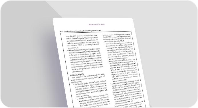 Recommendations and Reports BOX 1. (Continued) Lessons learned from the 2009 H1N1 pandemic response cruise ship (25). Moreover, an observational cohort care center or school closed temporarily in response to study of 259 households in the United Kingdom found the 2009 H1N1 pandemic, 90% of parents agreed with that administration of antiviral medications to 285 the dismissal decision, and 85% believed the dismissal confirmed patients and their 761 close contacts was reduced influenza transmission (27,28). very effective (92%) in preventing household – A total of 75% of parents who responded stated that transmission (26). the dismissal was not a problem, and 3% stated it • Although limited, the H1N1pdm09 experience suggests was a major problem. Approximately 20% of parents that antiviral chemoprophylaxis might be recommended reported that an adult in the household missed work in the future in some settings as an adjunct to self- because of the dismissal, and 19% had a child who quarantine, assuming that additional antiviral missed a free or reduced-cost lunch. Of these, 2% medications are on the market, providing more treatment and <1%, respectively, said missing work and choices and making the emergence of drug resistance missing lunch were major problems. less of a concern. However, this recommendation would – Most of the 523 parents polled believed that at least require much greater quantities of antiviral medications, one of the following factors was a major reason the even if no new products are developed, to ensure institution had closed: 1) to keep children apart and sufficient supplies. reduce the chance they would infect each other Mobilizing the public (81%), 2) because the school decided cleaning the Most members of the public complied with public building and surfaces that children touch was health recommendations regarding hand hygiene and important for reducing the spread of the illness social distancing. (73%), and 3) because the school or child care center • The Harvard Opinion Research Program conducted could not operate effectively when numerous 13 polls on the response of the U.S. public during the students were absent (58%). 2009–2010 pandemic, including the response of the • A study conducted through an online survey of school general public, pregnant women, new mothers, parents, principals showed that implementing NPIs in public and businesses. These randomized telephone polls schools in New York City, New York, was feasible during found the following: the 2009 H1N1 pandemic (29). Schools successfully – A total of 59% of 1,067 Americans reported washing implemented respiratory etiquette education, hand- their hands or using hand sanitizer more frequently hygiene measures, and environmental measures and during the 2009 H1N1 pandemic (27). A total of isolated ill students. Another online survey found that 25% avoided places where numerous people tend the majority of public schools in Georgia also were able to gather, such as sporting events, malls, or to successfully implement both personal and community public transportation. NPIs recommended by CDC (23). – Most (85%) of 514 pregnant women washed or Public health practitioners should be prepared to explain sanitized their hands more frequently to reduce the that the initial pandemic guidance might change if a chance of infection with H1N1pdm09 virus (27). pandemic is more or less severe than initially assessed. A total of 68% reported taking steps to avoid • Within 12 days of recognizing the emerging pandemic proximity to someone who had influenza-like on April 23, 2009, CDC updated its initial guidance symptoms, and 31% avoided mass gathering places. on NPIs (issued on May 1, 2009) on May 5, 2009, on Most (91%) of 526 new mothers also washed or the basis of more complete and robust data that sanitized their hands more frequently, and 81% took suggested that the majority of U.S. cases were less severe steps to avoid being near someone who had than those reported from Mexico. influenza-like symptoms. • Certain public health departments reported difficulties School-related NPIs, including school closures and in communicating the updated guidance on school dismissals, were acceptable and feasible. closures to their communities, especially communities • According to a Harvard Opinion Research Program that were planning to implement school closures or had poll of 523 parents from 39 U.S. states whose child already done so (30,31). 6 MMWR / April 21, 2017 / Vol. 66 / No. 1 US Department of Health and Human Services/Centers for Disease Control and Prevention