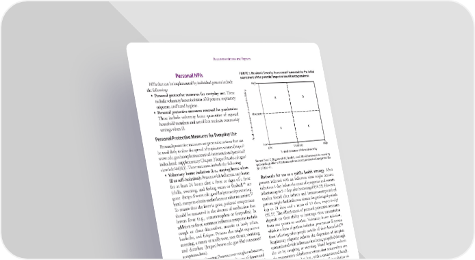 Recommendations and Reports Personal NPIS FIGURE 3. Pandemic Severity Assessment Framework for the initial assessment of the potential impact of an influenza pandemic NPIs that can be implemented by individual persons include High the following: y • Personal protective measures for everyday use: These include voluntary home isolation of ill persons, respiratory B D etiquette, and hand hygiene. • Personal protective measures reserved for pandemics: ansmissiblit These include voluntary home quarantine of exposed Moderate household members and use of face masks in community e of tr settings when ill. Personal Protective Measures for Everyday Use A C caled measur Personal protective measures are preventive actions that can S be used daily to slow the spread of respiratory viruses (https:// Low www.cdc.gov/nonpharmaceutical-interventions/personal/ Low Moderate High index.html; supplementary Chapter 3 https://stacks.cdc.gov/ Scaled measure of clinical severity view/cdc/44313). These measures include the following: Source: Reed C, Biggerstaff M, Finelli L, et al. Novel framework for assessing • Voluntary home isolation (i.e., staying home when epidemiologic effects of influenza epidemics and pandemics. Emerg Infect Dis 2013;19:85–91. ill or self-isolation): Persons with influenza stay home for at least 24 hours after a fever or signs of a fever Rationale for use as a public health strategy. Most (chills, sweating, and feeling warm or flushed)** are persons infected with an influenza virus might become gone (https://www.cdc.gov/flu/protect/preventing. infectious 1 day before the onset of symptoms and remain †† htm), except to obtain medical care or other necessities. infectious up to 5–7 days after becoming ill (54,55). However, To ensure that the fever is gone, patients’ temperature studies found that infants and immunocompromised should be measured in the absence of medication that persons might shed influenza viruses for prolonged periods lowers fever (e.g., acetaminophen or ibuprofen). In (up to 21 days and a mean of 19 days, respectively) addition to fever, common influenza symptoms include (56,57). The effectiveness of personal protective measures cough or chest discomfort, muscle or body aches, depends on their ability to interrupt virus transmission headache, and fatigue. Persons also might experience from one person to another. Voluntary home isolation, sneezing, a runny or stuffy nose, sore throat, vomiting, which is a form of patient isolation, prevents an ill person and diarrhea (https://www.cdc.gov/flu/consumer/ §§ from infecting other people outside of their household. symptoms.htm). Respiratory etiquette reduces the dispersion of droplets • Respiratory etiquette: Persons cover coughs and sneezes, contaminated with influenza virus being propelled through preferably with a tissue, and then dispose of tissues and the air by coughing or sneezing. Hand hygiene reduces disinfect hands immediately after a cough or sneeze, or (if the transmission of influenza viruses that occurs when one a tissue is not available) cough or sneeze into a shirt sleeve. person touches another (e.g., with a contaminated hand). Touching the eyes, nose, and mouth should be avoided to Contamination also can occur through self-inoculation via help slow the spread of germs (https://www.cdc.gov/flu/ fomite transmission (indirect contact transmission) when protect/covercough.htm). persons touch a contaminated surface and then touch • Hand hygiene: Persons perform regular and thorough their nose with a contaminated hand. A study conducted hand washing with soap and water (or use alcohol-based in households in Bangkok, Thailand, found that increased hand sanitizers containing at least 60% ethanol or handwashing reduced surface contamination with influenza isopropanol when soap and water are not available). virus, which lowered the potential for self-inoculation via fomite transmission (58). Additional studies found that ** Although many authorities use either 100°F or 100.4°F (37.8°C) as indicative influenza viruses can remain viable on the human hand for of fever, this number can vary depending on factors such as the method of measurement and the age of the person. Therefore, other values for fever could roughly 3–5 minutes (59) and that influenza viruses can be appropriate. CDC has public health recommendations that are based on remain on fingers for 30 minutes after contamination (60). the presence (or absence) of fever (i.e., persons’ temperature is not higher than their own normal temperature). §§ †† Additional information about isolation and quarantine is available at https:// Guidance for caring for persons at home who have influenza symptoms is www.cdc.gov/quarantine/QuarantineIsolation.html. available at https://www.cdc.gov/flu/consumer/caring-for-someone.htm. 12 MMWR / April 21, 2017 / Vol. 66 / No. 1 US Department of Health and Human Services/Centers for Disease Control and Prevention