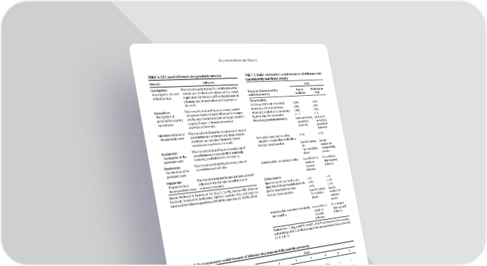 Recommendations and Reports TABLE 4. CDC novel influenza virus pandemic intervals TABLE 5. Initial assessment: scaled measures of influenza virus Intervals Indicators transmissibility and clinical severity Investigation: This interval is indicated by the identification of an Scale Investigation of novel animal case of influenza A subtype with potential Measures of transmissibility Low to Moderate to influenza cases implications for human health or identification of and clinical severity moderate high a human case of novel influenza A anywhere in Transmissibility the world. Secondary attack rate, household ≤20% >20% Recognition: This interval is indicated by an increasing number Attack rate, school or university ≤30% >30% Recognition of of cases or clusters of novel influenza A in humans Attack rate, workplace or community ≤20% >20% potential for ongoing and by virus characteristics indicating potential for R : basic reproductive number 1–1.7 ≥1.8 0 transmission ongoing human-to-human transmission Underlying population immunity Some underlying Little to no anywhere in the world. population underlying Initiation: Initiation of This interval is indicated by confirmation of cases of immunity population the pandemic wave novel influenza A in humans and demonstration immunity of efficient and sustained human-to-human Emergency department or other <10% ≥10% transmission anywhere in the world. outpatient visits for influenza-like illness Acceleration: This interval is indicated by an increasing rate of Virologic characterization Genetic markers Genetic Acceleration of the novel influenza A cases identified nationally, for markers for pandemic wave indicating establishment in the country. transmissibility transmissibility absent present Deceleration: This interval is indicated by decreasing rates of Deceleration of the novel influenza A infection. Animal models, transmission studies Less efficient or More efficient pandemic wave similar to than seasonal seasonal influenza Preparation: This interval is indicated by sporadic cases of novel influenza Preparation for a influenza A infection and surveillance rates Clinical severity future pandemic wave returning to baseline. Upper bound of case-fatality ratio <1% ≥1% Source: Holloway R, Rasmussen SA, Zaza S, Cox NJ, Jernigan DB; Influenza Upper bound of case-hospitalization ratio <10% ≥10% Pandemic Framework Workgroup. Updated preparedness and response Deaths-hospitalizations ratio <10% ≥10% framework for influenza pandemics. MMWR Recomm Rep 2014;63(No. RR-6). Virologic characterization Genetic markers Genetic for virulence markers for absent virulence present Animal models, evaluation of morbidity Less virulent or More virulent and mortality similar to than seasonal seasonal influenza influenza Source: Reed C, Biggerstaff M, Finelli L, et al. Novel framework for assessing epidemiologic effects of influenza epidemics and pandemics. Emerg Infect Dis 2013;19:85–91. TABLE 6. Refined assessment: scaled measures of influenza virus transmissibility and clinical severity Scale Measures of transmissibility and clinical severity 1 2 3 4 5 6 7 Transmissibility (scale of 1–5) Symptomatic attack rate, community ≤10% 11%–15% 16%–20% 21%–24% ≥25% — — Symptomatic attack rate, school ≤20% 21%–25% 26%–30% 31%–35% ≥36% — — Symptomatic attack rate, workplace ≤10% 11%–15% 16%–20% 21%–24% ≥25% — — Household secondary attack rate, symptomatic ≤5% 6%–10% 11%–15% 16%–20% ≥21% — — R : basic reproductive number ≤1.1 1.2–1.3 1.4–1.5 1.6–1.7 ≥1.8 — — 0 Peak percentage of outpatient visits for influenza-like illnes 1%–3% 4%–6% 7%–9% 10%–12% ≥13% — — Clinical severity (scale of 1–7) Case-fatality ratio <0.02% 0.02%–0.05% 0.05%–0.1% 0.1%–0.25% 0.25%–0.5% 0.5%–1% >1% Case-hospitalization ratio <0.5% 0.5%–0.8% 0.8%–1.5% 1.5%–3% 3%–5% 5%–7% >7% Deaths-hospitalizations ratio ≤3% 4%–6% 7%–9% 10%–12% 13%–15% 16%–18% >18% Source: Reed C, Biggerstaff M, Finelli L, et al. Novel framework for assessing epidemiologic effects of influenza epidemics and pandemics. Emerg Infect Dis 2013;19:85–91. US Department of Health and Human Services/Centers for Disease Control and Prevention MMWR / April 21, 2017 / Vol. 66 / No. 1 29