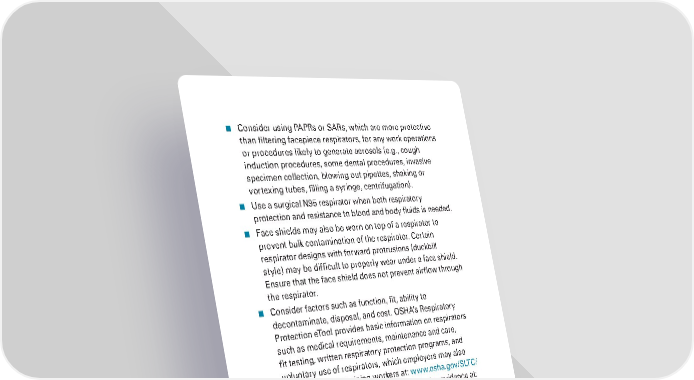 ■ Consider using PAPRs or SARs, which are more protective than filtering facepiece respirators, for any work operations or procedures likely to generate aerosols (e.g., cough induction procedures, some dental procedures, invasive specimen collection, blowing out pipettes, shaking or vortexing tubes, filling a syringe, centrifugation). ■ Use a surgical N95 respirator when both respiratory protection and resistance to blood and body fluids is needed. ■ Face shields may also be worn on top of a respirator to prevent bulk contamination of the respirator. Certain respirator designs with forward protrusions (duckbill style) may be difficult to properly wear under a face shield. Ensure that the face shield does not prevent airflow through the respirator. ■ Consider factors such as function, fit, ability to decontaminate, disposal, and cost. OSHA’s Respiratory Protection eTool provides basic information on respirators such as medical requirements, maintenance and care, fit testing, written respiratory protection programs, and voluntary use of respirators, which employers may also find beneficial in training workers at: www.osha.gov/SLTC/ etools/respiratory. Also see NIOSH respirator guidance at: www.cdc.gov/niosh/topics/respirators. ■ Respirator training should address selection, use (including donning and doffing), proper disposal or disinfection, inspection for damage, maintenance, and the limitations of respiratory protection equipment. Learn more at: www. osha.gov/SLTC/respiratoryprotection. ■ The appropriate form of respirator will depend on the type of exposure and on the transmission pattern of COVID-19. See the NIOSH “Respirator Selection Logic” at: www. cdc. gov/niosh/docs/2005-100/default.html or the OSHA “Respiratory Protection eTool” at www.osha.gov/ SLTC/etools/respiratory. OCCUPATIONAL SAFETY AND HEALTH ADMINISTRATION 16