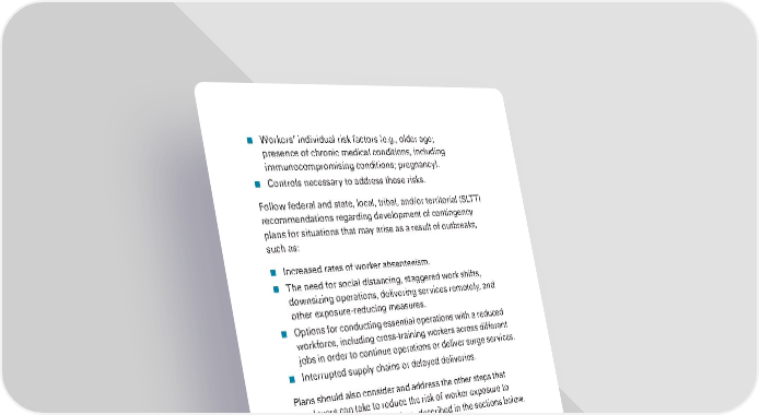 ■ Workers’ individual risk factors (e.g., older age; presence of chronic medical conditions, including immunocompromising conditions; pregnancy). ■ Controls necessary to address those risks. Follow federal and state, local, tribal, and/or territorial (SLTT) recommendations regarding development of contingency plans for situations that may arise as a result of outbreaks, such as: ■ Increased rates of worker absenteeism. ■ The need for social distancing, staggered work shifts, downsizing operations, delivering services remotely, and other exposure-reducing measures. ■ Options for conducting essential operations with a reduced workforce, including cross-training workers across different jobs in order to continue operations or deliver surge services. ■ Interrupted supply chains or delayed deliveries. Plans should also consider and address the other steps that employers can take to reduce the risk of worker exposure to SARS-CoV-2 in their workplace, described in the sections below. Prepare to Implement Basic Infection Prevention Measures For most employers, protecting workers will depend on emphasizing basic infection prevention measures. As appropriate, all employers should implement good hygiene and infection control practices, including: ■ Promote frequent and thorough hand washing, including by providing workers, customers, and worksite visitors with a place to wash their hands. If soap and running water are not immediately available, provide alcohol-based hand rubs containing at least 60% alcohol. ■ Encourage workers to stay home if they are sick. ■ Encourage respiratory etiquette, including covering coughs and sneezes. OCCUPATIONAL SAFETY AND HEALTH ADMINISTRATION 8