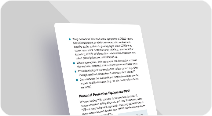 ■ Keep customers informed about symptoms of COVID-19 and ask sick customers to minimize contact with workers until healthy again, such as by posting signs about COVID-19 in stores where sick customers may visit (e.g., pharmacies) or including COVID-19 information in automated messages sent when prescriptions are ready for pick up. ■ Where appropriate, limit customers’ and the public’s access to the worksite, or restrict access to only certain workplace areas. ■ Consider strategies to minimize face-to-face contact (e.g., drive- through windows, phone-based communication, telework). ■ Communicate the availability of medical screening or other worker health resources (e.g., on-site nurse; telemedicine services). Personal Protective Equipment (PPE) When selecting PPE, consider factors such as function, fit, decontamination ability, disposal, and cost. Sometimes, when PPE will have to be used repeatedly for a long period of time, a more expensive and durable type of PPE may be less expensive overall than disposable PPE. Each employer should select High exposure risk jobs the combination of PPE that are those with high protects workers specific to potential for exposure their workplace. to known or suspected Workers with medium sources of COVID-19. exposure risk may need to Very high exposure risk wear some combination jobs are those with high of gloves, a gown, a face potential for exposure mask, and/or a face shield to known or suspected or goggles. PPE ensembles sources of COVID-19 for workers in the medium during specific medical, exposure risk category will postmortem, or laboratory vary by work task, the results procedures that involve of the employer’s hazard aerosol generation or assessment, and the types of specimen collection/ exposures workers have on handling. the job. OCCUPATIONAL SAFETY AND HEALTH ADMINISTRATION 22