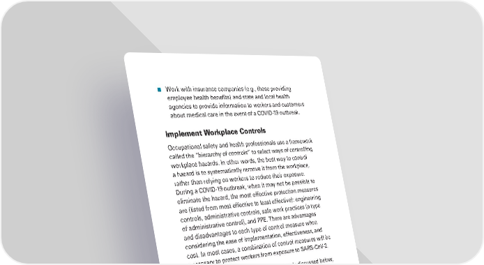 ■ Work with insurance companies (e.g., those providing employee health benefits) and state and local health agencies to provide information to workers and customers about medical care in the event of a COVID-19 outbreak. Implement Workplace Controls Occupational safety and health professionals use a framework called the “hierarchy of controls” to select ways of controlling workplace hazards. In other words, the best way to control a hazard is to systematically remove it from the workplace, rather than relying on workers to reduce their exposure. During a COVID-19 outbreak, when it may not be possible to eliminate the hazard, the most effective protection measures are (listed from most effective to least effective): engineering controls, administrative controls, safe work practices (a type of administrative control), and PPE. There are advantages and disadvantages to each type of control measure when considering the ease of implementation, effectiveness, and cost. In most cases, a combination of control measures will be necessary to protect workers from exposure to SARS-CoV-2. In addition to the types of workplace controls discussed below, CDC guidance for businesses provides employers and workers with recommended SARS-CoV-2 infection prevention strategies to implement in workplaces: www.cdc.gov/coronavirus/2019- ncov/specific-groups/guidance-business-response.html. Engineering Controls Engineering controls involve isolating employees from work- related hazards. In workplaces where they are appropriate, these types of controls reduce exposure to hazards without relying on worker behavior and can be the most cost-effective solution to implement. Engineering controls for SARS-CoV-2 include: ■ Installing high-efficiency air filters. ■ Increasing ventilation rates in the work environment. ■ Installing physical barriers, such as clear plastic sneeze guards. OCCUPATIONAL SAFETY AND HEALTH ADMINISTRATION 12