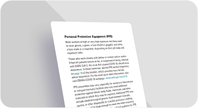 Personal Protective Equipment (PPE) Most workers at high or very high exposure risk likely need to wear gloves, a gown, a face shield or goggles, and either a face mask or a respirator, depending on their job tasks and exposure risks. Those who work closely with (either in contact with or within 6 feet of) patients known to be, or suspected of being, infected with SARS-CoV-2, the virus that causes COVID-19, should wear respirators. In these instances, see the PPE section beginning on page 14 of this booklet, which provides more details about respirators. For the most up-to-date information, also visit OSHA’s COVID-19 webpage: www.osha.gov/covid-19. PPE ensembles may vary, especially for workers in laboratories or morgue/mortuary facilities who may need additional protection against blood, body fluids, chemicals, and other materials to which they may be exposed. Additional PPE may include medical/surgical gowns, fluid-resistant coveralls, aprons, or other disposable or reusable protective clothing. Gowns should be large enough to cover the areas requiring protection. OSHA may also provide updated guidance for PPE use on its website: www.osha.gov/covid-19. NOTE: Workers who dispose of PPE and other infectious waste must also be trained and provided with appropriate PPE. The CDC webpage “Healthcare-associated Infections” (www. cdc.gov/hai) provides additional information on infection control in healthcare facilities. Workers Living Abroad or Travelling Internationally Employers with workers living abroad or traveling on international business should consult the “Business Travelers” section of the OSHA COVID-19 webpage (www.osha.gov/covid-19), which also provides links to the latest: GUIDANCE ON PREPARING WORKPLACES FOR COVID-19 25