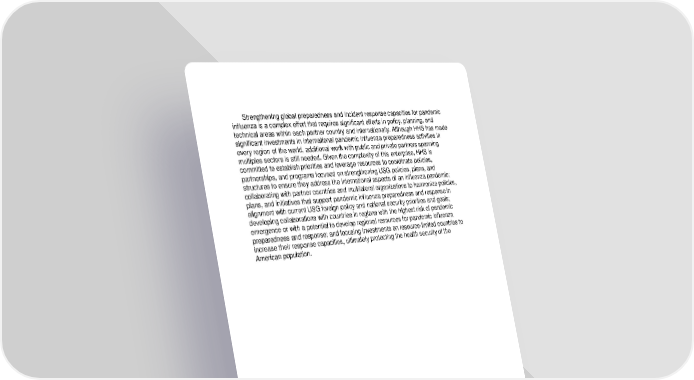 Strengthening global preparedness and incident response capacities for pandemic influenza is a complex effort that requires significant efforts in policy, planning, and technical areas within each partner country and internationally. Although HHS has made significant investments in international pandemic influenza preparedness activities in every region of the world, additional work with public and private partners spanning multiples sectors is still needed. Given the complexity of this enterprise, HHS is committed to establish priorities and leverage resources to coordinate policies, partnerships, and programs focused on strengthening USG policies, plans, and structures to ensure they address the international aspects of an influenza pandemic; collaborating with partner countries and multilateral organizations to harmonize policies, plans, and initiatives that support pandemic influenza preparedness and response in alignment with current USG foreign policy and national security priorities and goals; developing collaborations with countries in regions with the highest risk of pandemic emergence or with a potential to develop regional resources for pandemic influenza preparedness and response; and focusing investments on resource-limited countries to increase their response capacities, ultimately protecting the health security of the American population. 39