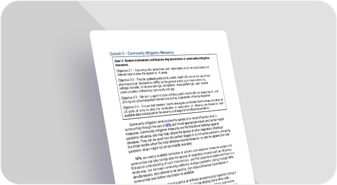 Domain 2 – Community Mitigation Measures Goal 2: Sustain momentum and improve implementation of community mitigation measures. .1 – Improve public awareness and implementation of non-pharmaceutical Objective 2 interventions to slow the spread of influenza. Objective 2 .2 – Provide updated guidance for public health officials on the use of non- pharmaceutical interventions (NPIs) by the general public and in key community settings (schools, child care settings, workplaces, mass gatherings), and improve communication to these key community settings. .3 – Maintain support of state and local public health officials preparing for, and Objective 2 utilizing non-pharmaceutical interventions during, a pandemic influenza response. Objective 2 .4 – Ensure that travelers’ health messages and border health measures taken at US ports of entry to slow the introduction or exportation of influenza are based on best available data and aligned to the severity and stage of the influenza pandemic. Community mitigation aims to slow the spread of a novel influenza virus in communities through the use of NPIs and threat-appropriate travel and border health measures. Community mitigation measures are the first line of defense against pandemic influenza, and may help reduce the spread of other respiratory infectious diseases. They can be used from the earliest stages of an influenza pandemic, including the initial months when the most effective countermeasure—a vaccine against the new pandemic virus—might not yet be broadly available. NPIs are readily available behaviors or actions and response measures people and communities can take to help slow the spread of respiratory viruses such as influenza. Enhanced understanding of such interventions, and the capacity to implement them in a timely way, can increase community resilience during a pandemic. Using multiple NPIs simultaneously, also referred to as layering, can reduce influenza transmission in communities even before vaccination is available. NPIs that all people should practice at all times are particularly important during a pandemic. These everyday preventive actions include staying home when sick, covering coughs and sneezes, frequent and appropriate hand-washing, and routine cleaning of frequently touched surfaces. Community-level interventions can be added during pandemics and implemented in a graded fashion depending on the severity of the pandemic; these include measures aimed to reduce social contacts between people in schools, workplaces, and other community settings. HHS is investing in evaluating the effectiveness and timing of implementing NPIs. Scientists already understand a great deal about which interventions are effective and when to implement them; ongoing research will augment the science base for NPIs. Using the best available science, HHS continues to develop and disseminate public health communication and educational materials on the use of NPIs, for the general public, such as websites, posters, checklists, and fact sheets. In accordance with cultural and health literacy best practices, all communication materials use plain 18