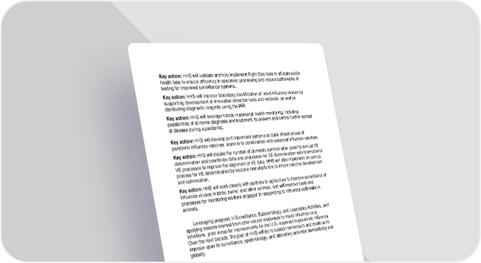 Key action: HHS will validate and fully implement Right Size tools in all state public health labs to ensure efficiency in specimen processing and reduce bottlenecks of testing for improved surveillance systems. Key action: HHS will improve laboratory identification of novel influenza viruses by supporting development of innovative detection tools and methods, as well as distributing diagnostic reagents using the IRR. Key action: HHS will leverage trends in personal health monitoring, including possibilities of at-home diagnosis and treatment, to prevent and control further spread of disease during a pandemic. Key action: HHS will develop and implement systems to track effectiveness of pandemic influenza vaccines, alone or in combination with seasonal influenza vaccines. Key action: HHS will double the number of domestic sentinel sites used for annual VE determination and coordinate data and processes for VE determination with international VE processes to improve the alignment of VE data. HHS will also implement an annual process for VE determination by vaccine manufacturers to inform vaccine development and optimization. Key action: HHS will work closely with partners in agriculture to improve surveillance of influenza viruses in birds, swine, and other animals, and will improve tools and processes for monitoring workers engaged in responding to influenza outbreaks in animals. Leveraging progress in Surveillance, Epidemiology, and Laboratory Activities, and applying lessons learned from other recent responses to novel influenza virus infections, yield areas for improvements for the U.S. response to pandemic influenza. Over the next decade, the goal of HHS will be to sustain momentum and continue to improve upon its surveillance, epidemiology, and laboratory activities domestically and globally. 17