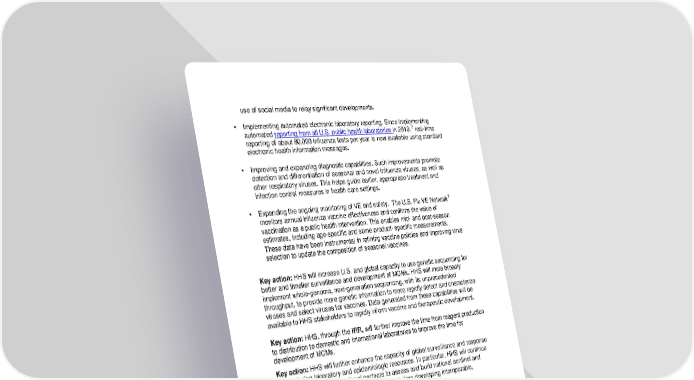 use of social media to relay significant developments. • Implementing automated electronic laboratory reporting. Since implementing 2 automated reporting from all U.S. public health laboratories in 2010, real-time reporting of about 80,000 influenza tests per year is now available using standard electronic health information messages. • Improving and expanding diagnostic capabilities. Such improvements promote detection and differentiation of seasonal and novel influenza viruses, as well as other respiratory viruses. This helps guide earlier, appropriate treatment and infection control measures in health care settings. 3 • Expanding the ongoing monitoring of VE and safety. The U.S. Flu VE Network monitors annual influenza vaccine effectiveness and confirms the value of vaccination as a public health intervention. This enables mid- and post-season estimates, including age-specific and some product- specific measurements. These data have been instrumental in refining vaccine policies and improving virus selection to update the composition of seasonal vaccines. Key action: HHS will increase U.S. and global capacity to use genetic sequencing for better and timelier surveillance and development of MCMs. HHS will more broadly implement whole-genome, next-generation sequencing, with its unprecedented throughput, to provide more genetic information to more rapidly detect and characterize viruses and select viruses for vaccines. Data generated from these capabilities will be available to HHS stakeholders to rapidly inform vaccine and therapeutic development. Key action: HHS, through the IRR, will further improve the time from reagent production to distribution to domestic and international laboratories to improve the time for development of MCMs. Key action: HHS will further enhance the capacity of global surveillance and response by bolstering laboratory and epidemiologic resources. In particular, HHS will continue to collaborate with international partners to assess and build national sentinel and laboratory-based surveillance capabilities, including developing interoperable, interconnected electronic reporting systems. Key action: HHS will leverage “Big Data” to improve its ability to monitor and describe influenza disease and conduct epidemiologic studies. HHS will use supplemental data sources (such as electronic health records, social media, or big-data repositories) to better monitor and characterize potential pandemic influenza activity in as close to real time as possible. It will utilize innovative data sources and models to better forecast disease emergence and patterns. 2 Lamb E, et al. Update on Progress in Electronic Reporting of Laboratory Results to Public Health Agencies — United States, 2014. MMWR Morb Mortal Wkly Rep 2015; 64(12):328-330. 3 See Centers for Disease Control and Prevention. Seasonal Influenza Vaccine Effectiveness, 2005–2016. Atlanta, GA: CDC, 2016. Accessed 7/31/2016. 16