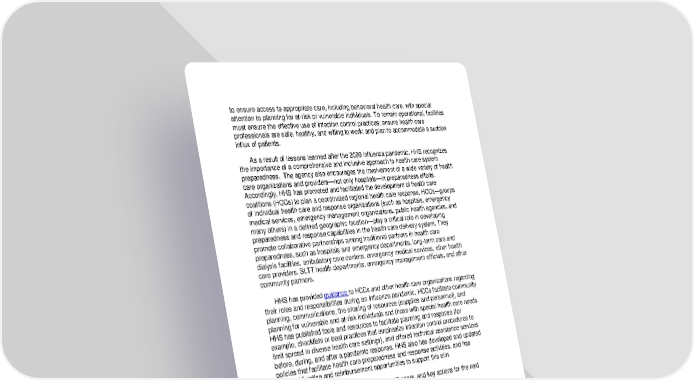 to ensure access to appropriate care, including behavioral health care, with special attention to planning for at-risk or vulnerable individuals. To remain operational, facilities must ensure the effective use of infection control practices; ensure health care professionals are safe, healthy, and willing to work; and plan to accommodate a sudden influx of patients. As a result of lessons learned after the 2009 influenza pandemic, HHS recognizes the importance of a comprehensive and inclusive approach to health care system preparedness. The agency also encourages the involvement of a wide variety of health care organizations and providers—not only hospitals—in preparedness efforts. Accordingly, HHS has promoted and facilitated the development of health care coalitions (HCCs) to plan a coordinated regional health care response. HCCs—groups of individual health care and response organizations (such as hospitals, emergency medical services, emergency management organizations, public health agencies, and many others) in a defined geographic location—play a critical role in developing preparedness and response capabilities in the health care delivery system. They promote collaborative partnerships among traditional partners in health care preparedness, such as hospitals and emergency departments, long-term care and dialysis facilities, ambulatory care centers, emergency medical services, other health care providers, SLTT health departments, emergency management officials, and other community partners. to HCCs and other health care organizations regarding HHS has provided guidance their roles and responsibilities during an influenza pandemic. HCCs facilitate community planning, communications, the sharing of resources (supplies and personnel), and planning for vulnerable and at-risk individuals and those with special health care needs. HHS has published tools and resources to facilitate planning and response (for example, checklists or best practices that emphasize infection control procedures to limit spread in diverse health care settings), and offered technical assistance services before, during, and after a pandemic response. HHS also has developed and updated health care preparedness and response activities, and has policies that facilitate provided funding and reimbursement opportunities to support this aim. Notable areas of progress over the past 10 years, and key actions for the next decade, include the following: • Connecting more than 28,000 members as part of HCCs formed among states, localities, and various provider settings to help coordinate a regional health care response. • Developing and testing Flu on Call™, a network of telephone triage lines staffed by information specialists and medical professionals, and a service that builds on existing infrastructure to support state and local entities in their efforts to improve access to antiviral medications. Flu on Call™ reduces both the need for face-to- face provider encounters, and surge on medical facilities during a severe pandemic event. • Providing, at the local or state level, almost 50,000 Medical Reserve Corps 28