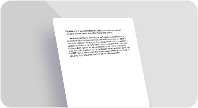 Key Action: HHS will integrate behavioral health, organizational and resilience research in communications about NPI and community resilience. Incorporating behavioral, organizational, and health literacy research and using community-driven channels to communicate about NPIs are relatively new aspects of community mitigation. Fully engaging diverse stakeholders in problem-solving before a pandemic contributes to community resilience and can help slow disease transmission in communities if vaccines are not readily available or until vaccines or other MCMs arrive. Leveraging progress in Community Mitigation, and applying lessons learned from ill the 2009 influenza pandemic and other recent responses to novel influenza viruses w yield areas for potential breakthroughs for the next influenza pandemic. 20