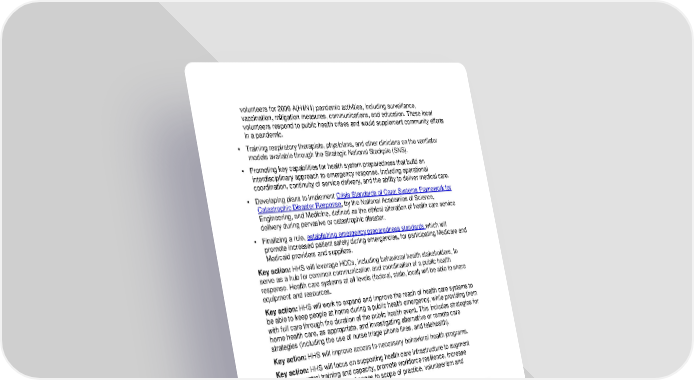 volunteers for 2009 A(H1N1) pandemic activities, including surveillance, vaccination, mitigation measures, communications, and education. These local volunteers respond to public health crises and would supplement community efforts in a pandemic. • Training respiratory therapists, physicians, and other clinicians on the ventilator models available through the Strategic National Stockpile (SNS). • Promoting key capabilities for health system preparedness that build an interdisciplinary approach to emergency response, including operational coordination, continuity of service delivery, and the ability to deliver medical care. • Developing plans to implement Crisis Standards of Care: Systems Framework for Catastrophic Disaster Response, by the National Academies of Science, Engineering, and Medicine, defined as the ethical alteration of health care service delivery during pervasive or catastrophic disaster. • Finalizing a rule, establishing emergency preparedness standards which will promote increased patient safety during emergencies, for participating Medicare and Medicaid providers and suppliers. Key action: HHS will leverage HCCs, including behavioral health stakeholders, to serve as a hub for common communication and coordination of a public health response. Health care systems at all levels (federal, state, local) will be able to share equipment and resources. Key action: HHS will work to expand and improve the reach of health care systems to be able to keep people at home during a public health emergency, while providing them with full care through the duration of the public health event. This includes strategies for home health care, as appropriate, and investigating alternative or remote care strategies (including the use of nurse triage phone lines, and telehealth). Key action: HHS will improve access to necessary behavioral health programs. Key action: HHS will focus on supporting health care infrastructure to augment infection control training and capacity, promote workforce resilience, increase system capabilities through changes to scope of practice, volunteerism and credentialing. Health delivery system reform efforts of the past decade have made today’s health care system dramatically different from 2005, when the HHS Pandemic Influenza Plan was released. The next 10 years will bring even more changes to delivery settings, provider types, reimbursement models, the sharing of electronic health information, referral patterns, business relationships, and expanded individual choice. HHS must keep abreast of these changes and adapt tools and strategies accordingly. 29