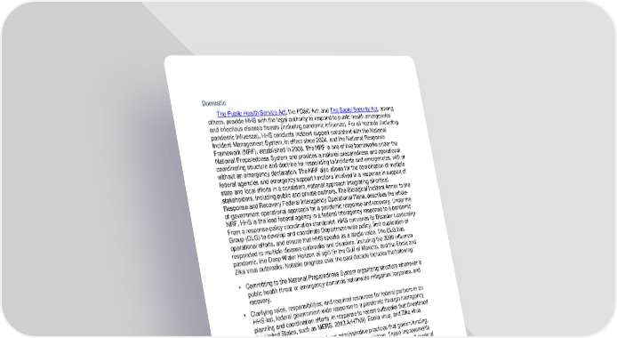 Domestic The Public Health Service Act; the FD&C Act; and The Social Security Act, among others, provide HHS with the legal authority to respond to public health emergencies and infectious disease threats (including pandemic influenza). For all hazards (including pandemic influenza), HHS conducts incident support consistent with the National Incident Management System, in effect since 2004, and the National Response Framework (NRF), established in 2008. The NRF is one of five frameworks under the National Preparedness System and provides a national preparedness and operational coordinating structure and doctrine for responding to incidents and emergencies, with or allows for the coordination of multiple without an emergency declaration. The NRF also federal agencies and emergency support functions involved in a response in support of state and local efforts in a consistent, national approach integrating all critical stakeholders, including public and private partners. The Biological Incident Annex to the Response and Recovery Federal Interagency Operational Plans, describes the whole- of-government operational approach for a pandemic response and recovery. Under the NRF, HHS is the lead federal agency in a federal interagency response to a pandemic. From a response policy coordination standpoint, HHS convenes its Disaster Leadership artment-wide poli Group (DLG) to develop and coordinate Dep cy, limit duplication of operational efforts, and ensure that HHS speaks as a single voice. The DLG has responded to multiple disease outbreaks and disasters, including the 2009 influenza pandemic, the Deep Water Horizon oil spill (in the Gulf of Mexico), and the Ebola and Zika virus outbreaks. Notable progress over the past decade includes the following: • Committing to the National Preparedness System organizing structure whenever a public health threat or emergency demands nationwide mitigation, response, and recovery. • Clarifying roles, responsibilities, and required resources for federal partners in an HHS-led, federal government-wide response to a pandemic through interagency planning and coordination efforts, in response to recent outbreaks that threatened the United States, such as MERS, 2013 A(H7N9), Ebola virus, and Zika virus. • Identifying and improving fiscal and administrative practices that govern funding, procurement, contracting, grants management, and hiring. These improvements should accelerate, streamline, and accountably manage responses at all levels of government touched by HHS’s efforts. • Leveraging state and local health departments’ incorporation of administrative and fiscal processes into their emergency response plans. These processes include emergency procurement, contracting, and hiring. Health departments must define how these processes differ from normal operations. Further, state-level grantees of HHS public health emergency preparedness and response funds are required to establish procedures for efficiently allocating those funds to local health departments. Grantees also must develop reporting and monitoring methods to ensure accountability. • Increasing attention to the depletion of human resources supporting the services integral to emergency response. For example, laboratory services and the staff to 36