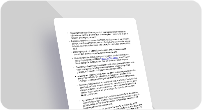• Assessing the safety and immunogenicity of various combinations of stockpiled adjuvants and vaccines in clinical trials to meet regulatory requirements for use in mitigating an emerging pandemic. • Expanding types of vaccinators and settings to include pharmacists and retail clinic settings, more than tripling the number of U.S. adults who report receiving seasonal influenza vaccine at a pharmacy or retail setting, from 6% in 2007 to almost 25% in 2015. • Improving capability of electronic health records (EHR) to directly populate immunization information systems, to improve vaccine order. • Modernizing HHS’s ability to manage vaccine orders and distribution logistics through implementation of CDC’s Vaccine Tracking System, across the United States through the 64 CDC-funded state and local immunization programs. • Developing and applying epidemiological modeling tools developed for use in public health emergencies, including influenza pandemics, to inform policy, clinical guidance, and response strategies involving the use of MCMs. • Analyzing and modeling product needs and gaps through interagency collaboration, through the PHEMCE, and establishing stockpiling goals across pandemic influenza countermeasures through the PHEMCE requirements-setting process. • Discovering broad-spectrum monoclonal antibodies, host-targeted therapeutic drug candidates, and small molecule antivirals with novel mechanisms of action. Some of these candidates have shown preliminary activity against wild-type and drug- resistant influenza viruses and are currently under evaluation in Phase 2 and Phase 3 clinical trials. • Approaching full FDA approval for a next-generation ventilator for all populations, which will mean a more affordable ventilator with increased neonatal capability. In addition, HHS is leading efforts to determine the feasibility of standardized and interchangeable ventilator components. • Developing technology and processes that allow for rapid production of N95 respirators, to significantly increase respirator supply during an influenza pandemic. At the same time, HHS supports development and use considerations for effective reusable respirators that will reduce the burden to produce and dispense large volumes of disposable respirators during an outbreak. • Improving the understanding of respirator and other PPE use practices. Areas of research have evolved to include effectiveness, availability, selection, and use to better inform decisions and guidance during a pandemic response. • Procuring millions of courses of antiviral drugs, including pediatric formulations, to achieve national stockpiling goals and sustaining products through extended product shelf life and stability testing. • Deploying vaccine internationally through the WHO Pandemic Influenza A(H1N1) Vaccine Deployment Initiative, and antiviral drugs to Mexico and the Pan American 24