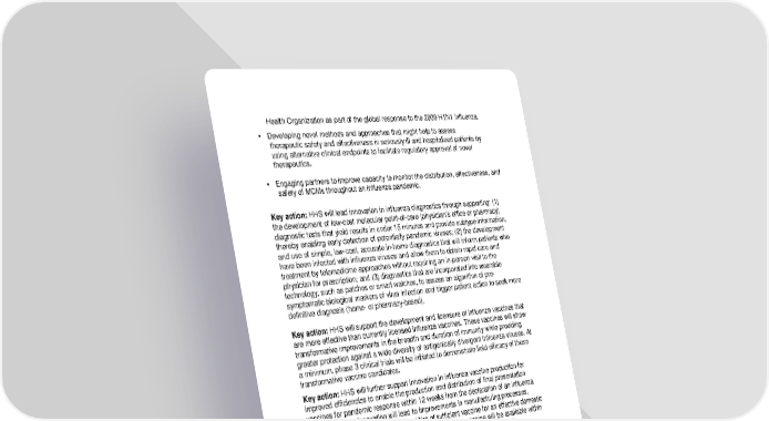 Health Organization as part of the global response to the 2009 H1N1 influenza. • Developing novel methods and approaches that might help to assess therapeutic safety and effectiveness in seriously ill and hospitalized patients by using alternative clinical endpoints to facilitate regulatory approval of novel therapeutics. • Engaging partners to improve capacity to monitor the distribution, effectiveness, and safety of MCMs throughout an influenza pandemic. Key action: HHS will lead innovation in influenza diagnostics through supporting: (1) the development of low-cost molecular point-of-care (physician’s office or pharmacy) diagnostic tests that yield results in under 15 minutes and provide subtype information, thereby enabling early detection of potentially pandemic viruses; (2) the development and use of simple, low-cost, accurate in-home diagnostics that will inform patients who have been infected with influenza viruses and allow them to obtain rapid care and treatment by telemedicine approaches without requiring an in-person visit to the physician for prescription; and (3) diagnostics that are incorporated into wearable technology, such as patches or smart watches, to assess an algorithm of pre- symptomatic biological markers of virus infection and trigger patient action to seek more definitive diagnosis (home- or pharmacy-based). Key action: HHS will support the development and licensure of influenza vaccines that are more effective than currently licensed influenza vaccines. These vaccines will show transformative improvements in the breadth and duration of immunity while providing greater protection against a wide diversity of antigenically divergent influenza viruses. At a minimum, phase 3 clinical trials will be initiated to demonstrate field efficacy of these transformative vaccine candidates. Key action: HHS will further support innovation in influenza vaccine production for improved efficiencies to enable the production and distribution of final presentation vaccines for pandemic response within 12 weeks from the declaration of an influenza pandemic. Such innovation will lead to improvements in manufacturing processes, platforms, formulation and filling quantities of sufficient vaccine for an effective domestic pandemic response and to meet the public demand for vaccine will be available within four months of a pandemic declaration with first doses available in 12 weeks. Key action: HHS will engage with private sector partners to develop and share strategies and priorities for MCM supply chain preparedness, as well as discuss capabilities and challenges faced by manufacturers and distributors and other elements critical to maintaining a resilient supply chain during a pandemic influenza event. Key action: HHS will continue to work with state and local governments, hospitals networks, and the private sector (including manufacturers, distributors, pharmacies and professional societies) to improve operational plans for rapid and widespread distribution, dispensing, and administration of vaccines and other medical countermeasures. In addition, advancing efforts in monitoring MCM and vaccine use, safety, and effectiveness during a public health emergency will be a priority using 25